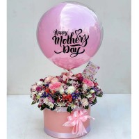 This elegant pink round gift box features a lush, vibrantly arranged bouquet of mixed flowers including pink roses and various colorful chrysanthemums, topped with a large, clear bubble balloon that contains a smaller pink balloon with a stylish "Happy Mother's Day" script and a small floral-patterned gift tag, all beautifully presented with a pink ribbon. Send this stunning floral arrangement to brighten her world and celebrate the extraordinary woman she is on her birthday or this Mother's Day.